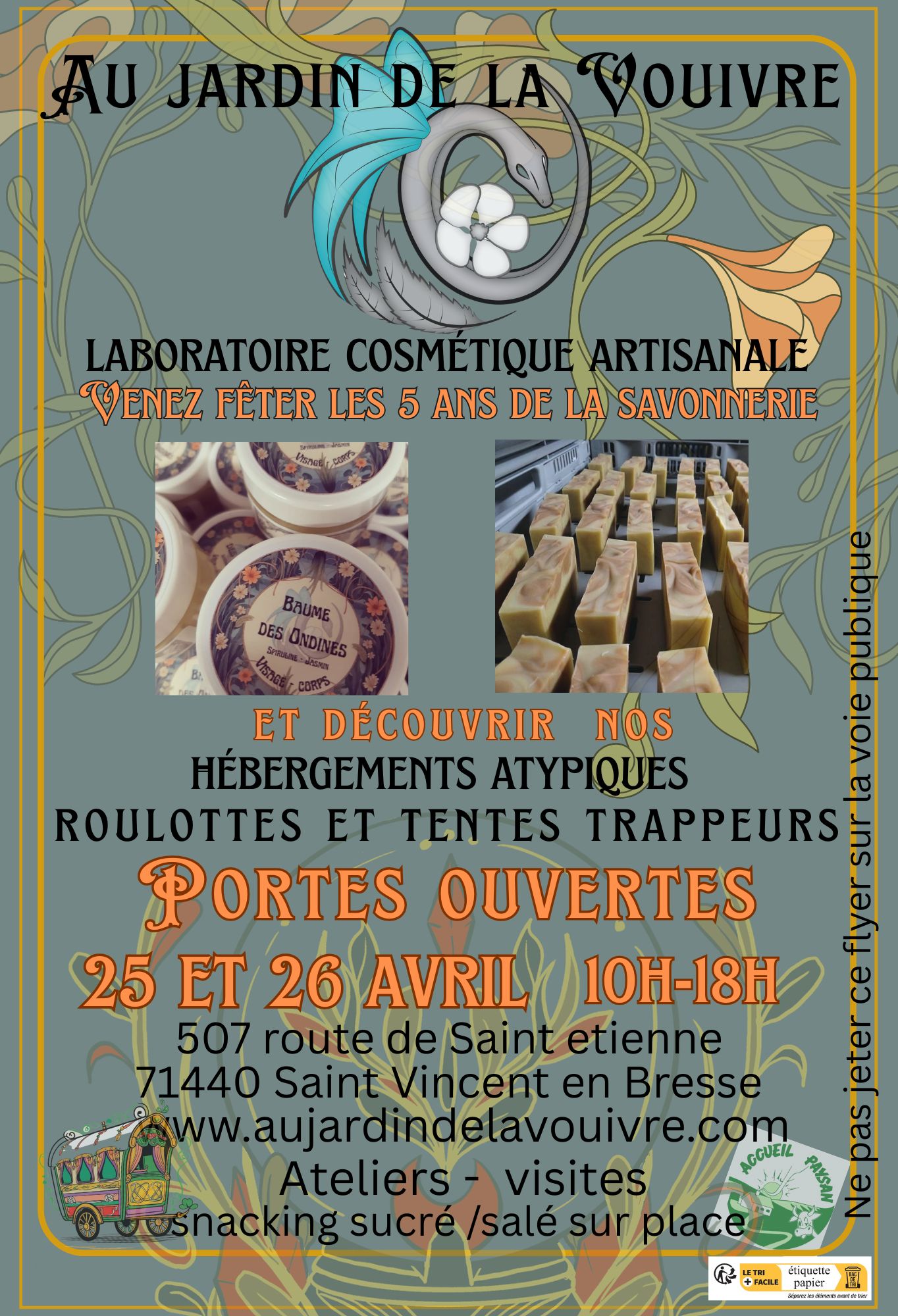 Une savonnerie au savoir faire artisanal utilisant des produits naturels d’origine biologique. Le jardin de la Vouivre est également un écolieu qui produit en agro-écologie sur un site de 2 hectares et propose des accueils touristiques en hébergement insolite.