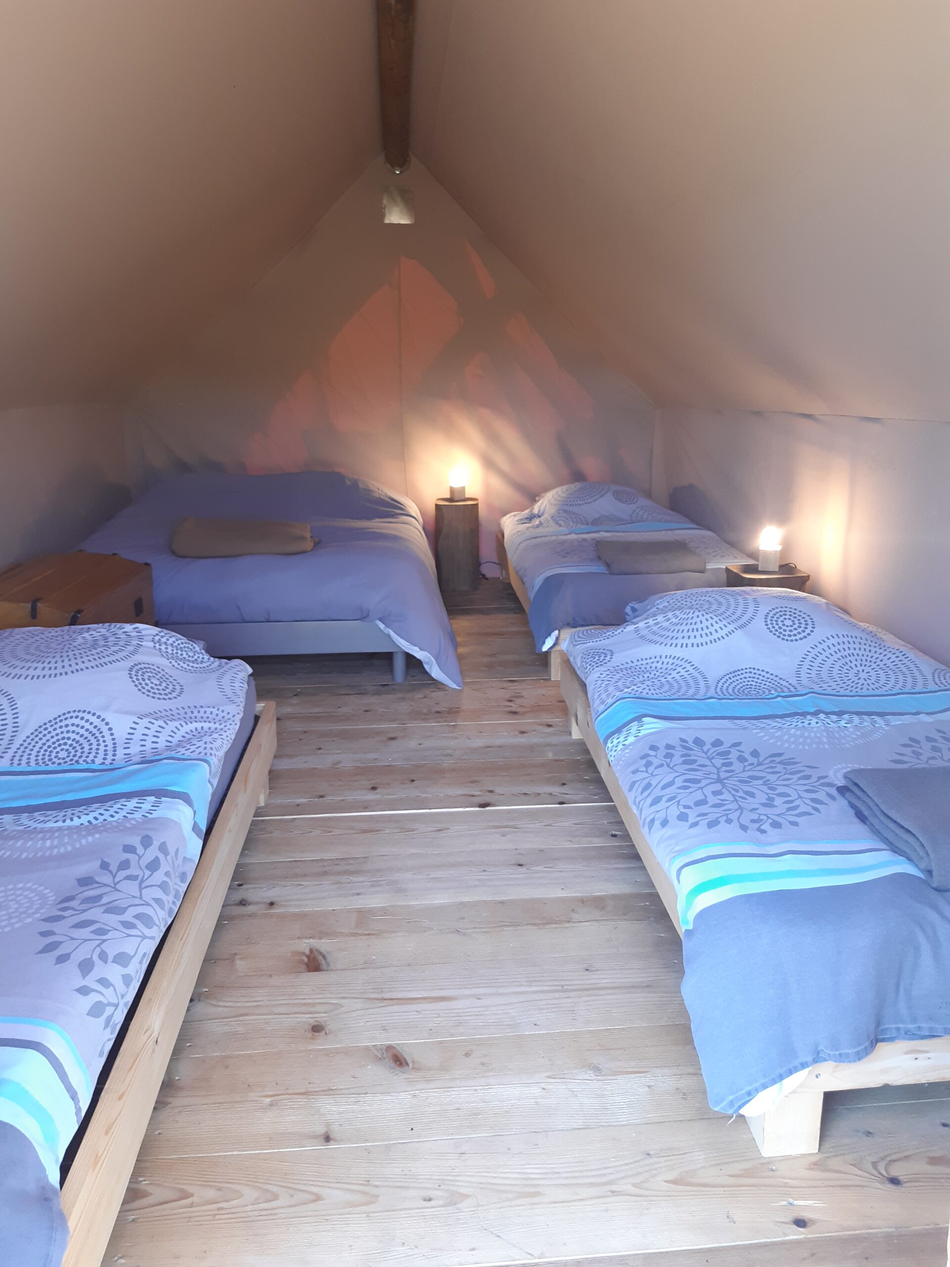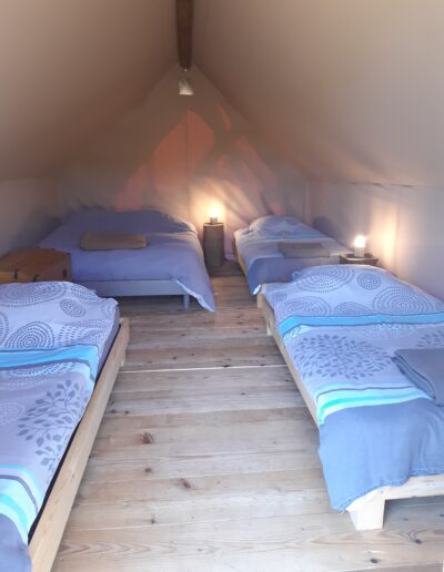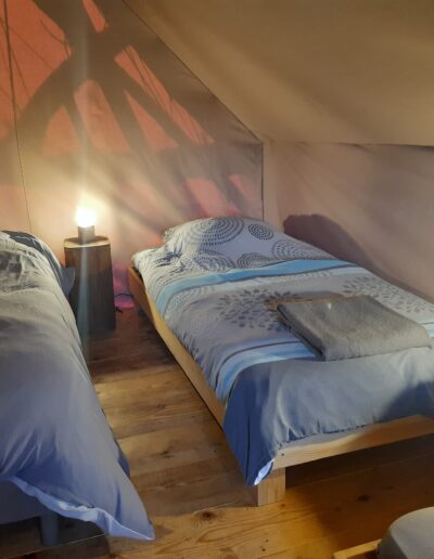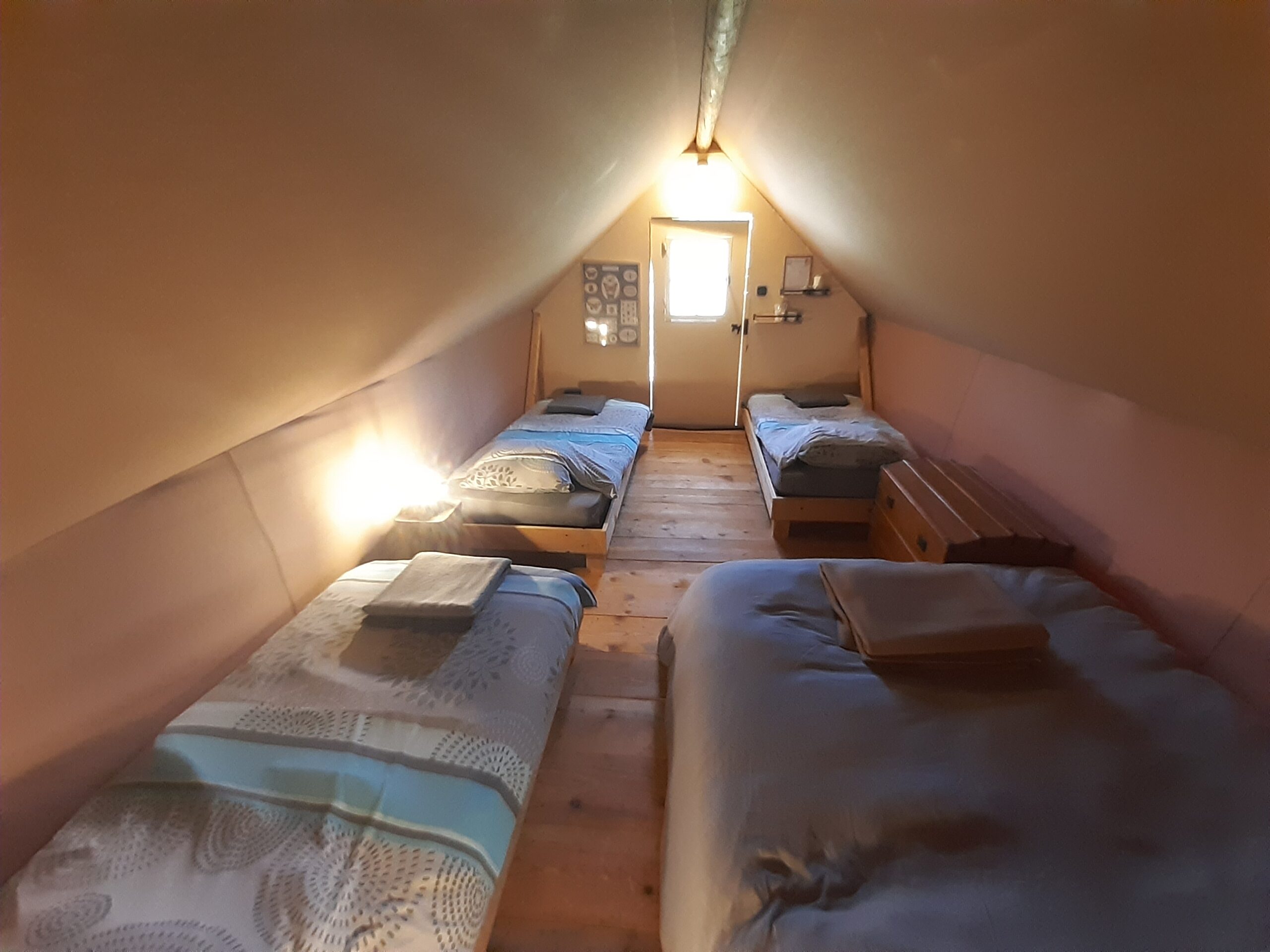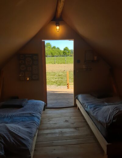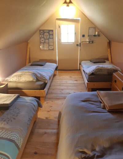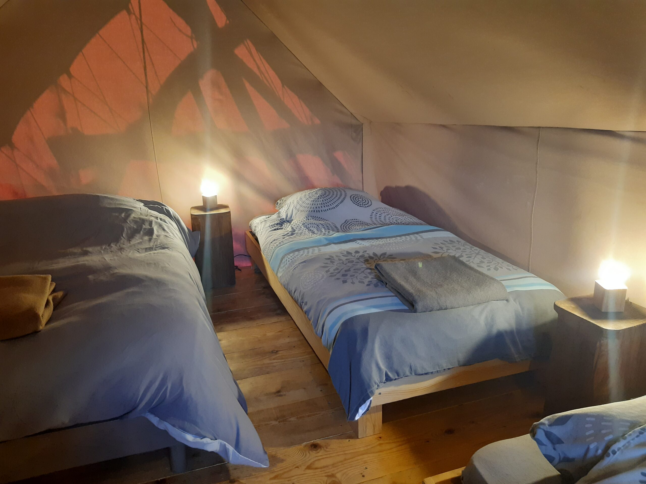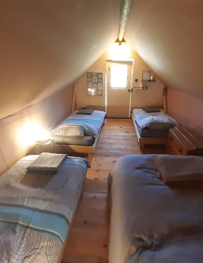 Il est possible de dormir dans la tente trappeur Grâce jusqu’à 5 personnes maximum . Vous trouverez un lit double ainsi que trois lits une personne.