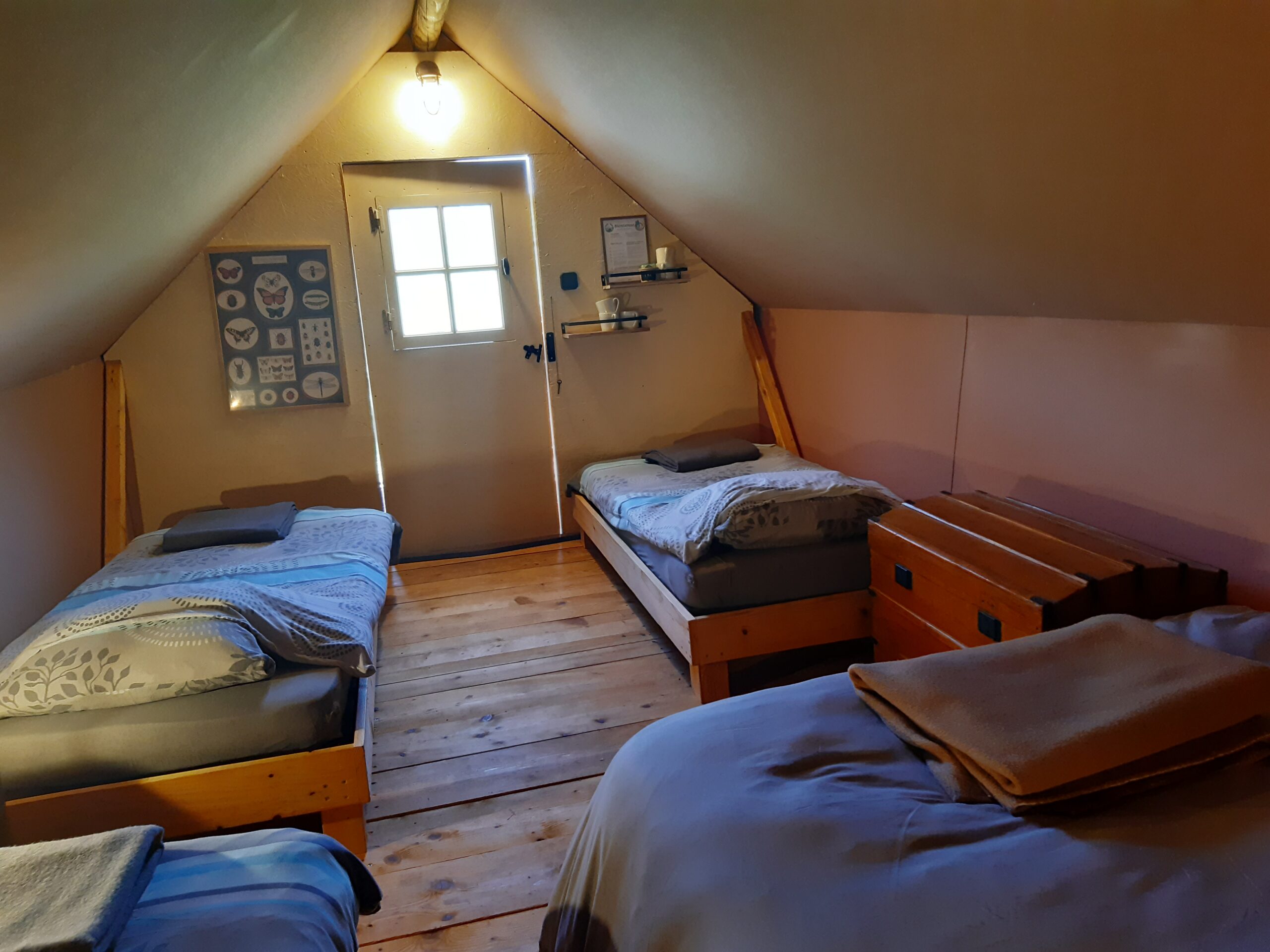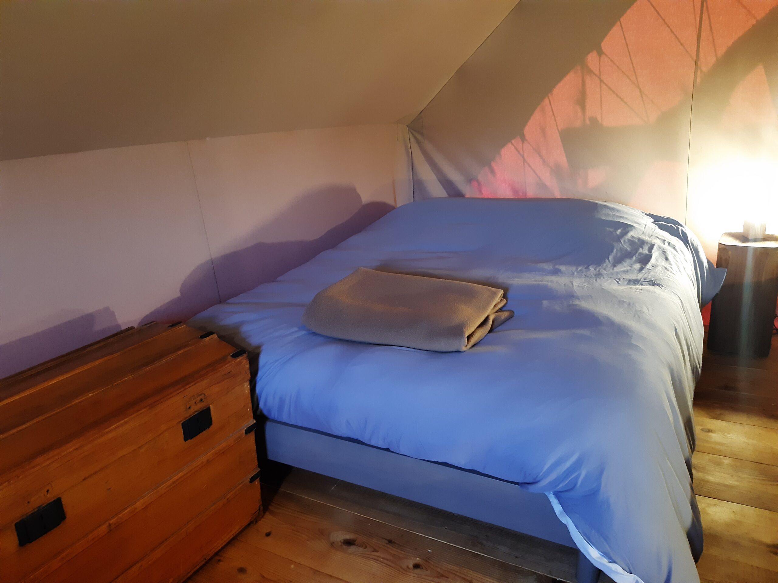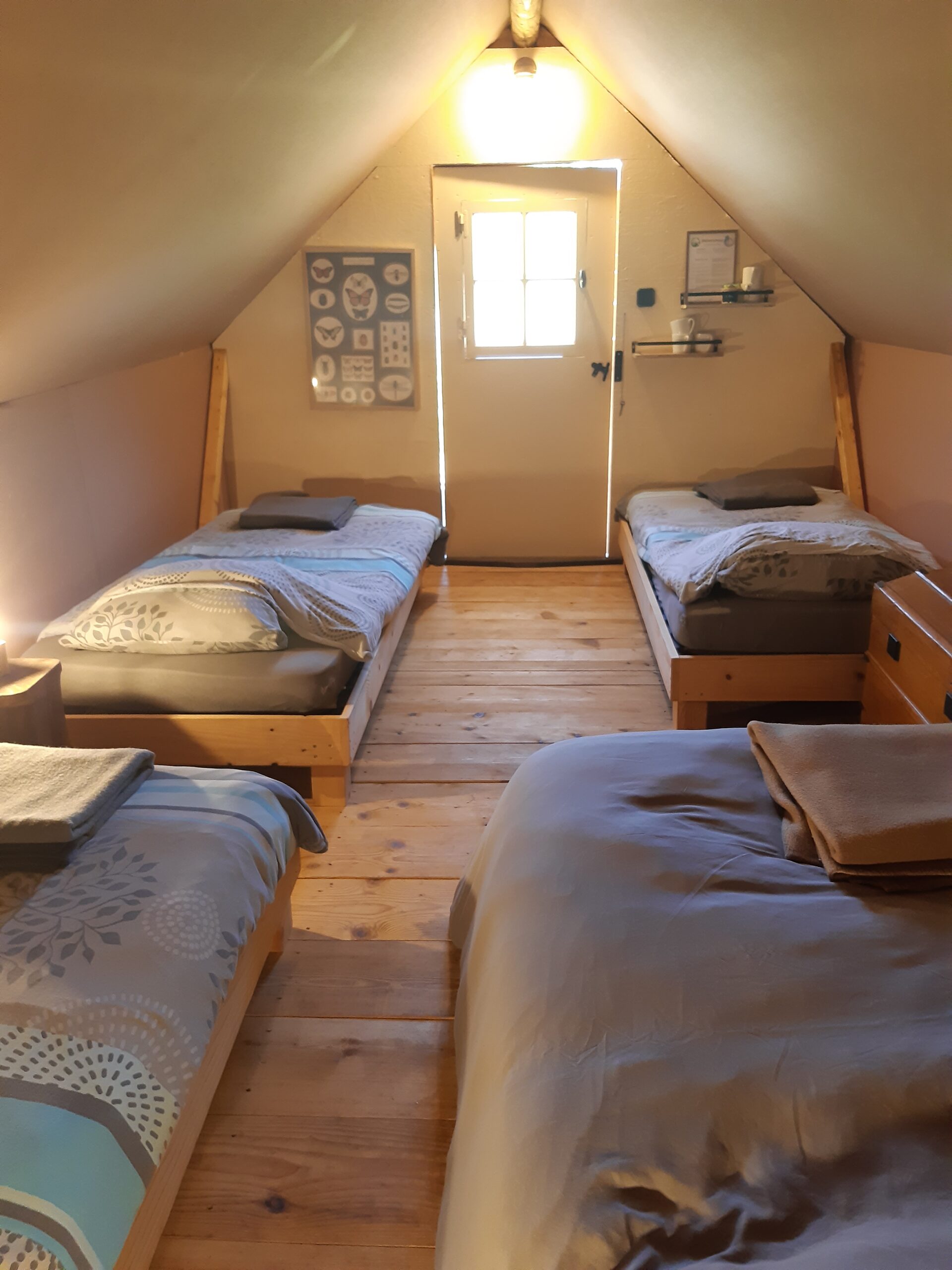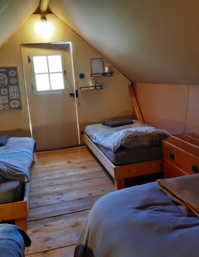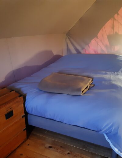 Il est possible de dormir dans la tente trappeur Grâce jusqu’à 5 personnes maximum . Vous trouverez un lit double ainsi que trois lits une personne.