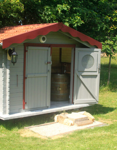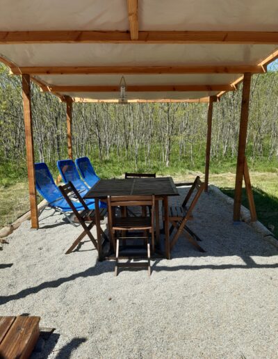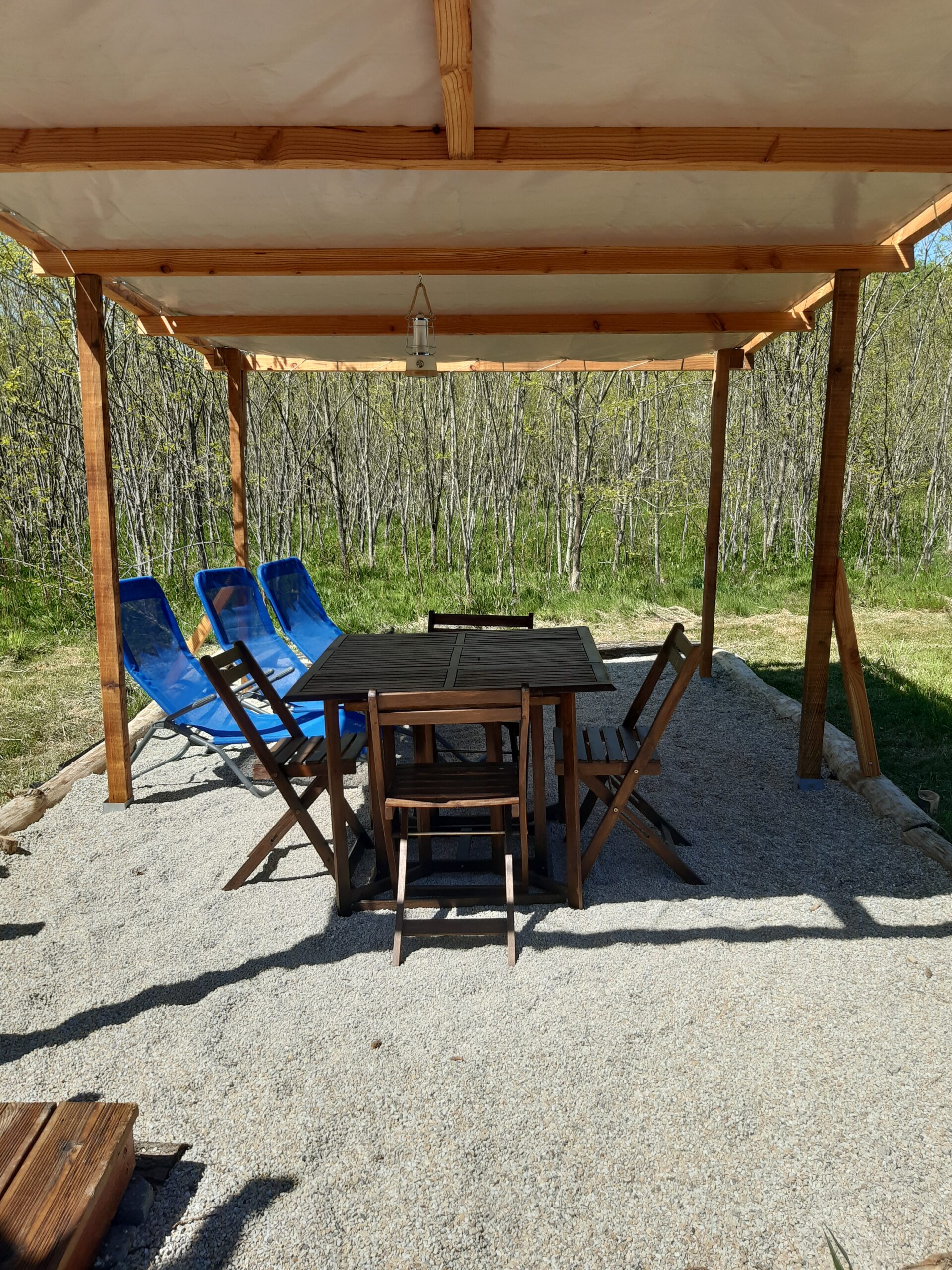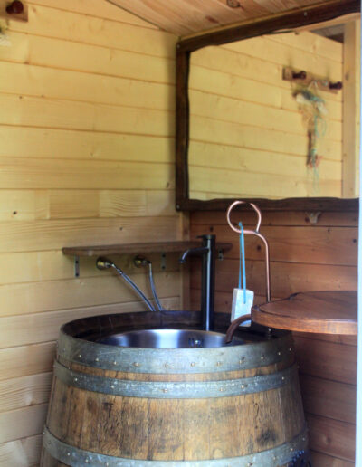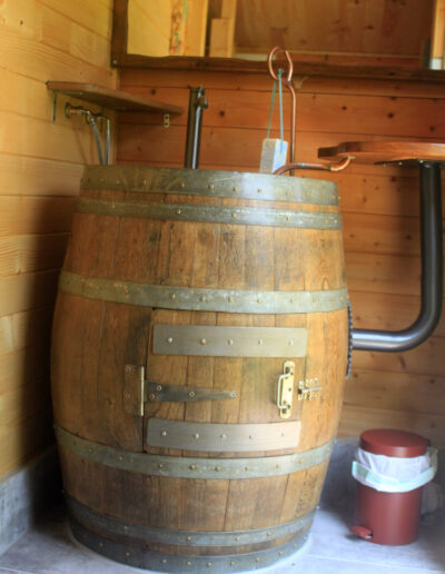 Un toilette sèche est attenant à la tente, et un bloc sanitaire avec douche, toilette et lavabo ainsi qu’un frigo sera disponible également pour les locataires.
